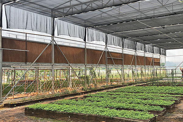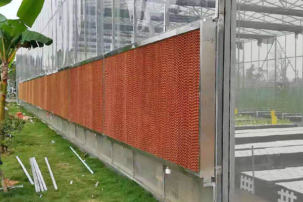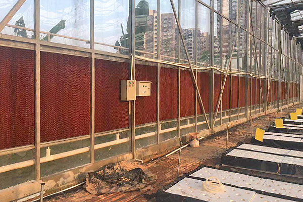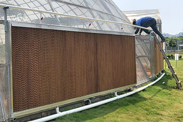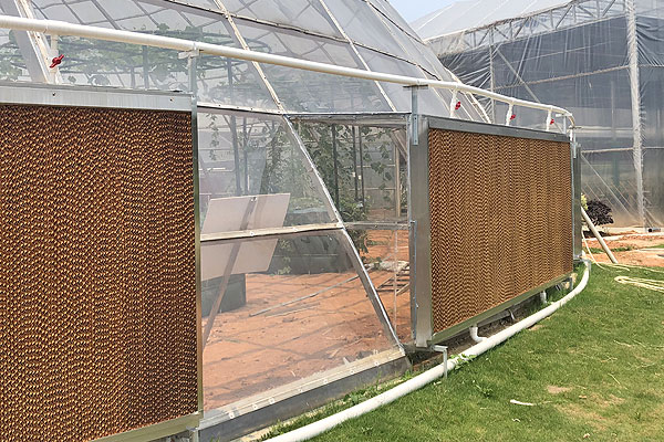 對於無法(fǎ)安裝環保空(kōng)調的區域,采用濕簾工程進行降溫。室外熱空氣經過濕簾,溫度降低(dī)後輸入(rù)室內,變得(dé)清涼舒適,同時有一定的含氧量,也能助於植物生長。